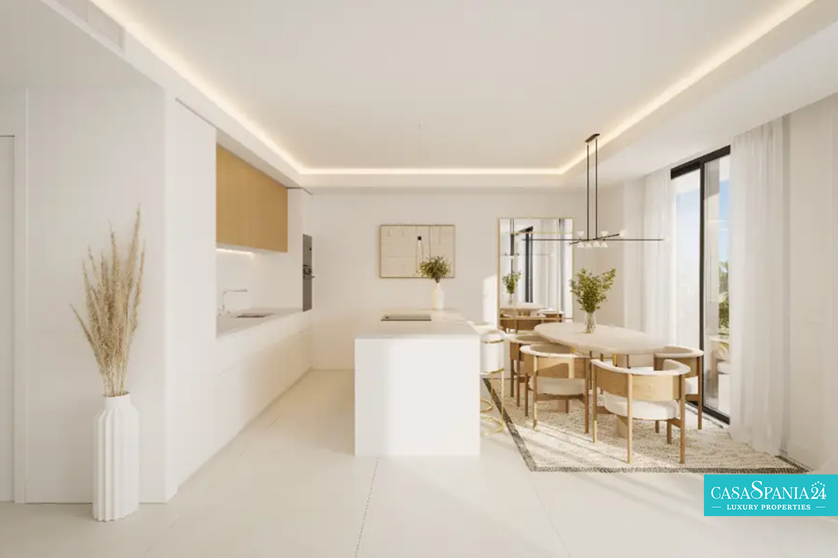Bucătăria este complet utilată cu electrocasnice moderne și finisaje de calitate superioară. Aceasta include plită cu inducție amplasată pe insulă sau peninsulă, hotă de tavan, coloană cu cuptor electric și cuptor cu microunde, mașină de spălat vase integrată, frigider-congelator integrat și mașină de spălat cu uscător. De asemenea, beneficiază de blat de lucru cu placaj antistropi, chiuvetă și baterie monocomandă, toate concepute pentru funcționalitate și estetică.