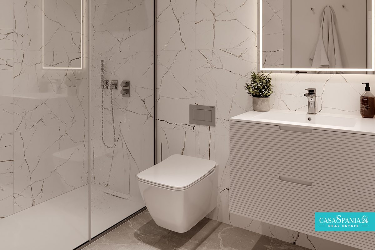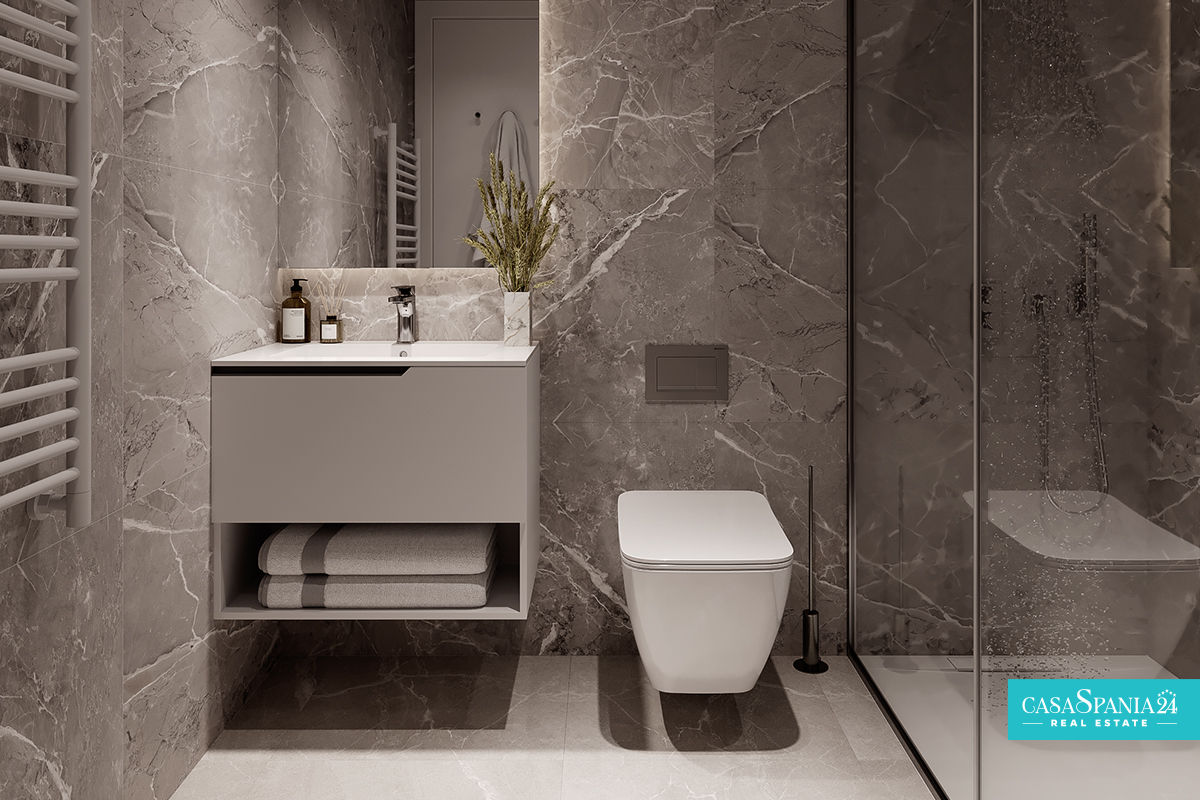 Acest apartament elegant dispune de 2 dormitoare spațioase, 2 băi moderne, un living generos cu bucătărie open-space, o terasă de 28 m² perfectă pentru relaxare în aer liber, o grădină privată de 30 m², boxă de depozitare și un loc de parcare dedicat. Fiecare detaliu este gândit pentru a oferi confort, funcționalitate și un stil de viață modern într-un cadru mediteranean de excepție.