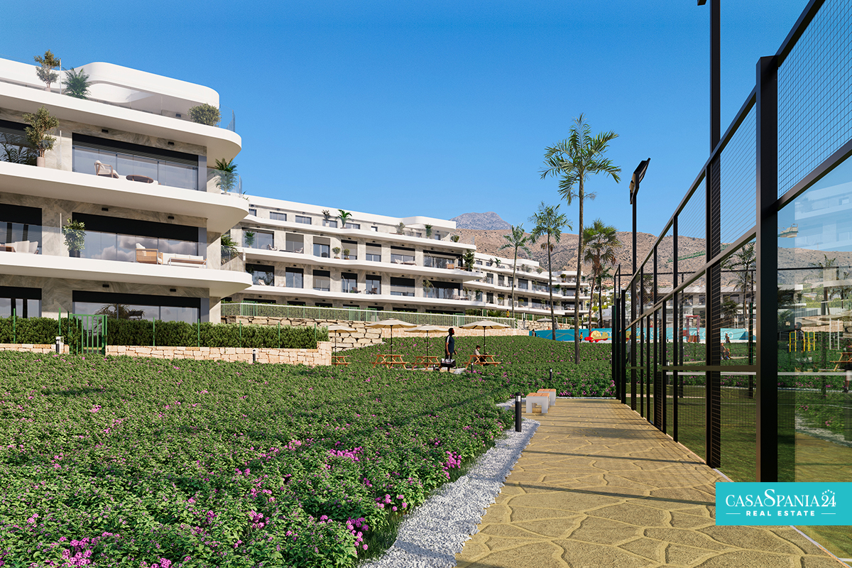 Complexul oferă o gamă largă de facilități premium: o piscină infinity spectaculoasă cu vedere la Marea Mediterană, terenuri de paddle tenis, sală de sport complet echipată, saună, zone de calistenie, grădini amenajate, spațiu de coworking, teren de pétanque, zone de picnic și locuri dedicate familiei – inclusiv un club pentru copii și un loc de joacă modern.