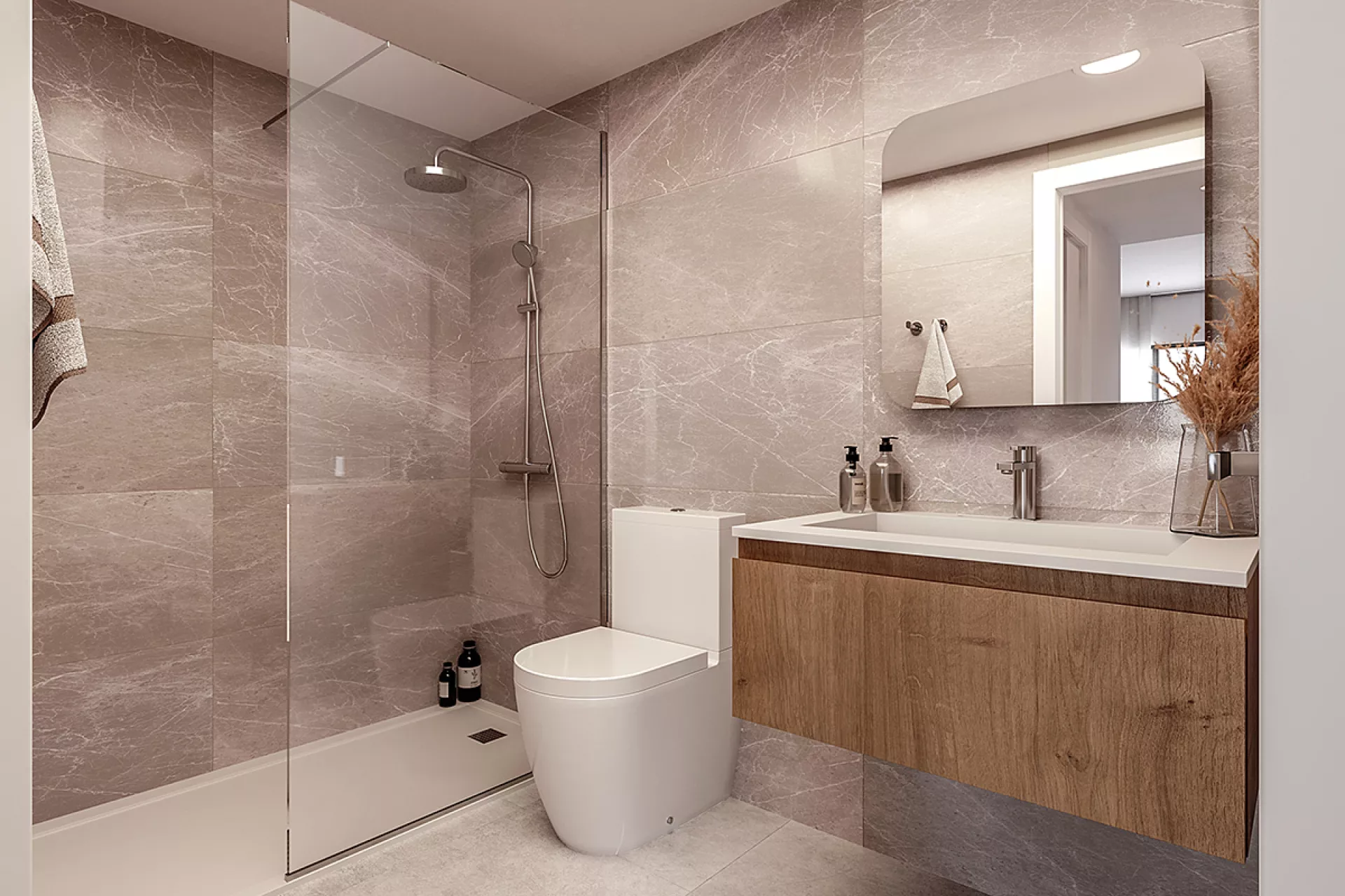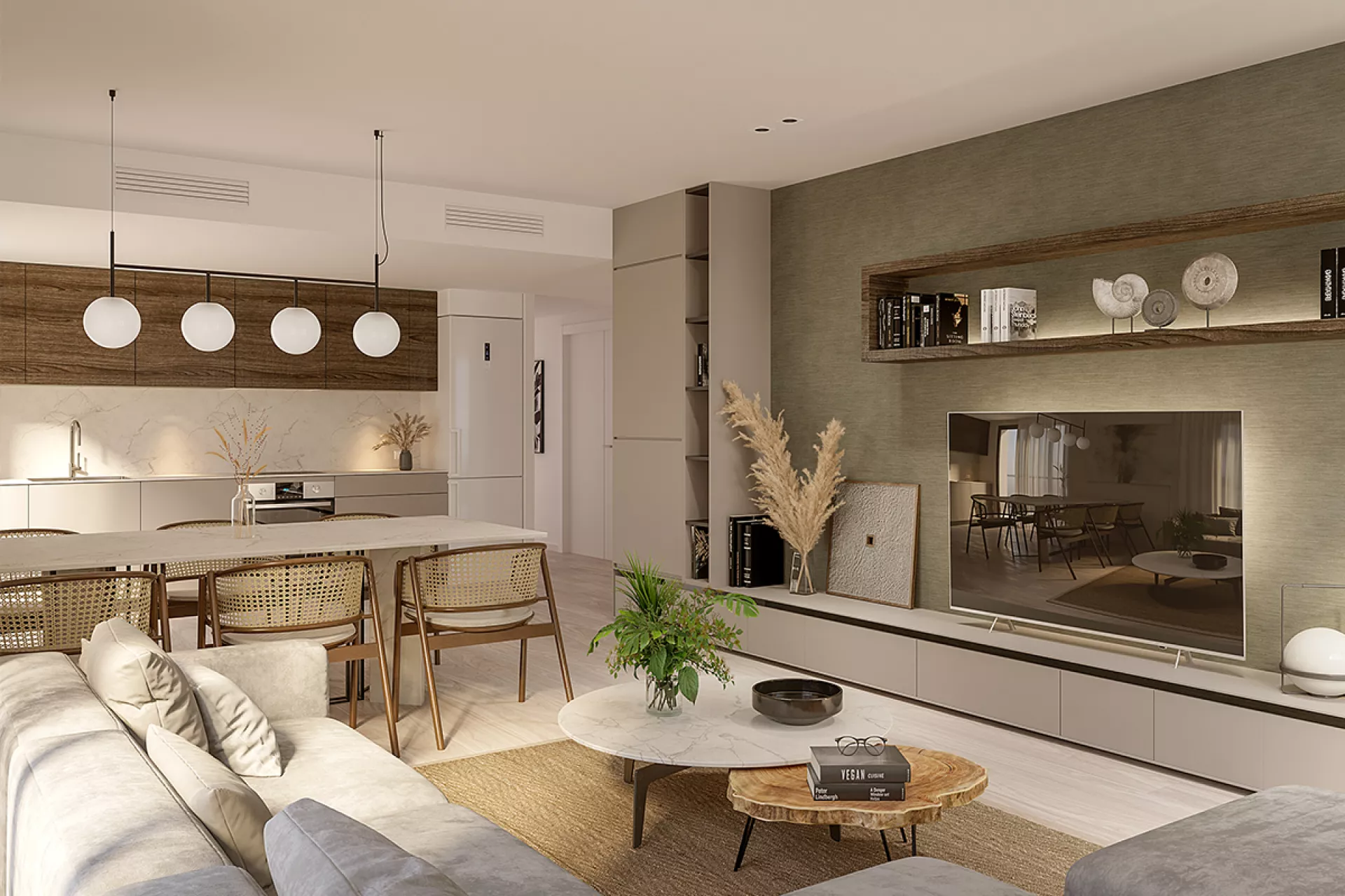 Apartament cu 3 dormitoare, 2 băi, o bucătărie în plan deschis și un living/sufragerie. Terasele spațioase se integrează în living datorită ferestrelor mari.
