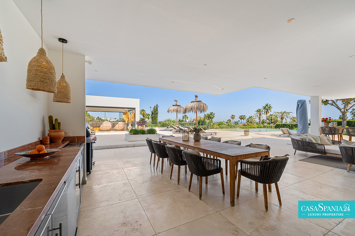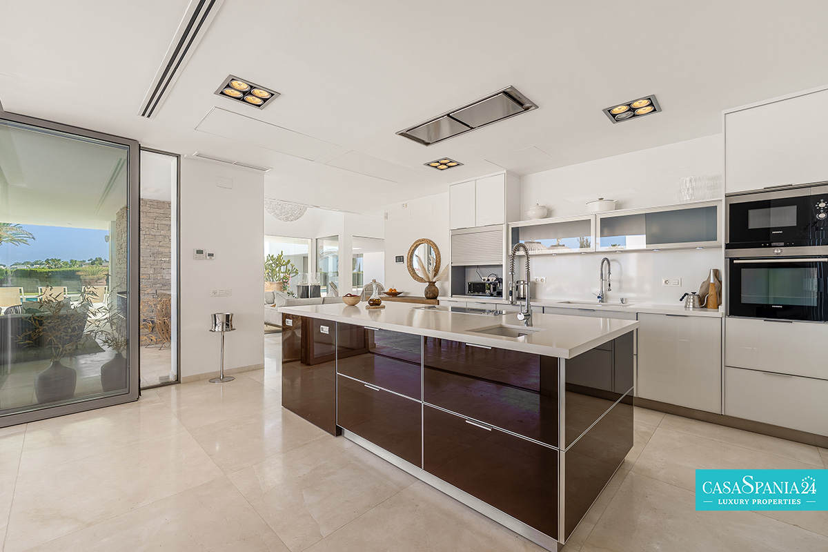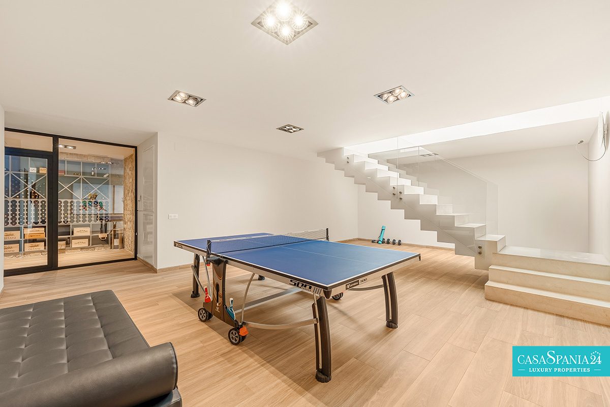 Elementul central al casei este bucătăria contemporană, echipată cu aparatură premium, mobilier modern și o zonă de dining generoasă, înconjurată de ferestre panoramice. Exteriorul este la fel de impresionant, cu o piscină spectaculoasă cu jacuzzi, zonă de relaxare în stil balinez și terasă acoperită cu șemineu și grătar, perfectă pentru socializare. Proprietatea dispune, de asemenea, de un teren privat de tenis, completând imaginea unei reședințe ce definește luxul contemporan în decor mediteranean, unde confortul, rafinamentul și locația se îmbină armonios.