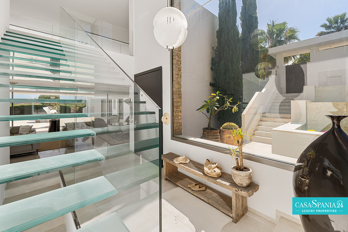 Interiorul impresionează prin spații ample, atent concepute, unde texturile naturale și finisajele de înaltă calitate creează o atmosferă sofisticată și primitoare. Tavanele înalte, corpurile de iluminat elegante și trecerea fluidă dintre interior și exterior sporesc senzația de libertate și confort. Zonele de zi sunt decorate cu mobilier realizat la comandă, materiale organice și piese decorative atent alese, precum lucrări artistice textile și ceramică artizanală. La etaj, un hol tip galerie oferă o perspectivă elegantă asupra nivelului principal și acces către dormitoare cu terase private și priveliști impresionante.