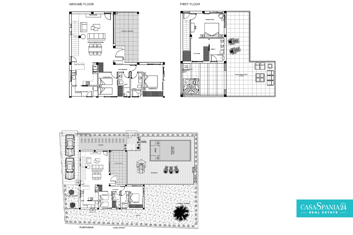 Exteriorul vilei completează perfect eleganța interioară. Grădina privată găzduiește o piscină spectaculoasă de 8x4 metri, ideală pentru a vă bucura de clima blândă a Mediteranei. Cele trei terase oferă multiple zone de relaxare, iar garajul privat și spațiul de depozitare adițional adaugă un plus de funcționalitate acestei proprietăți excepționale.